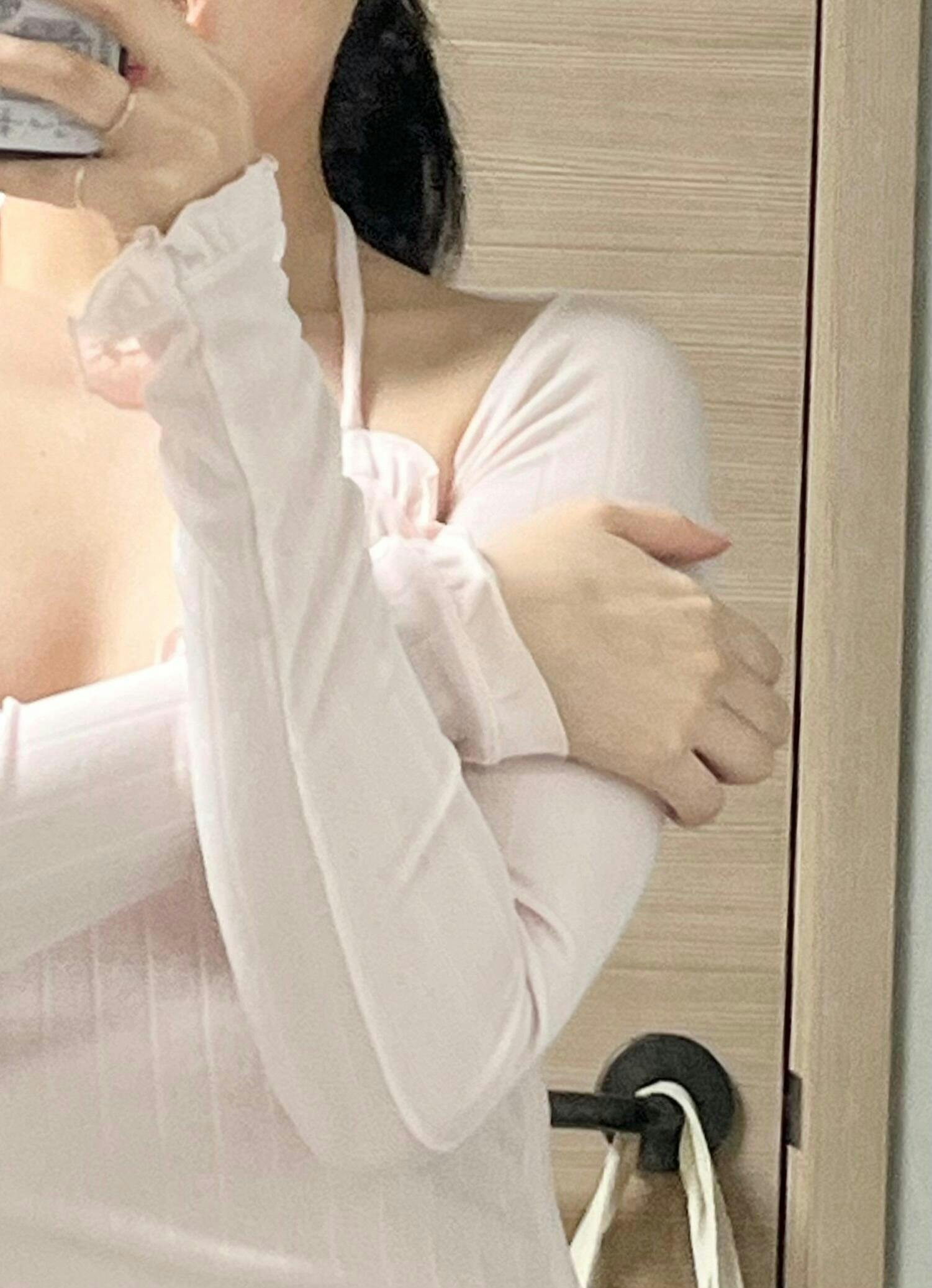 세트로 안입어도 다른 나시랑 매치해도 좋을 것 같아요 . 키가 커서 팔 길이는 살짝 아쉽구.. 마르신 분들에게 더 어울릴 것 같아요. 저는 팔뚝살이 ㅜㅜ 그치만 이쁨! 손끝에 프릴도 이쁩니당
