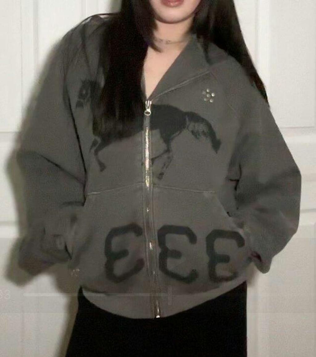 Out of all the Threetimes hoodies I've seen I think this is the cutest design! There are so many details with the graphics and cubic studs. I'm a US Size Small and this fits great on me. Slightly oversized but it's not long so it'll match with anything. The sleeves are slightly puffed with a cinched wrist which makes the silhouette really pretty. Note that the wrist and waist band is a slightly lighter gray than the rest of the hoodie but I like that detail. The inside isn't fleece which I like bc I can wear it for many seasons without it getting too hot. It has some weight to it understandably and the hood is quite big (slightly pointy at the top). I'd love to see this in a black version too <3